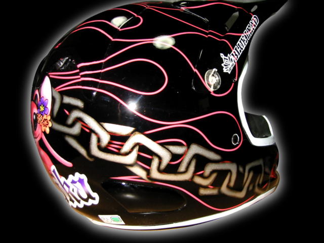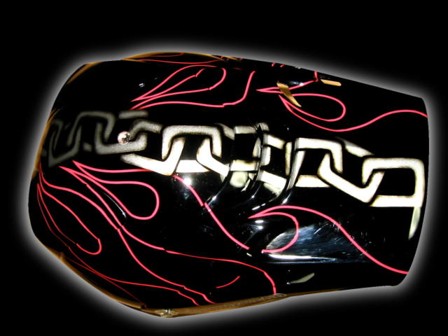 ■ブラックをベースにチェーン模様がエアブラシで入る。バックのイラストに合わせてピンストをピンクで。