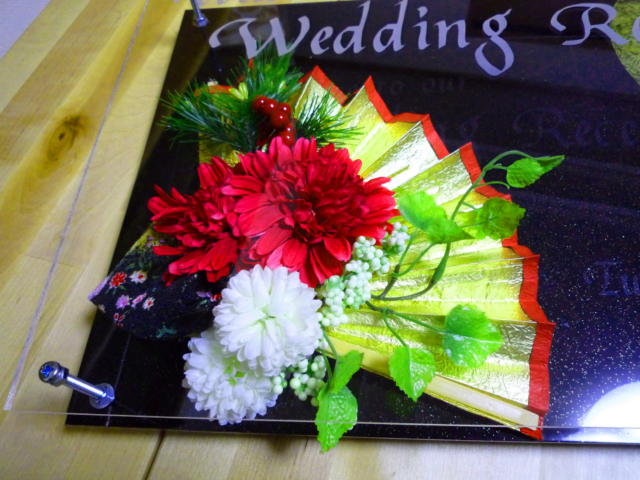 扇子と共にアレンジした造花をアクリルとの間に配置しています。